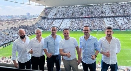 Técnico Vítor Pereira (o quarto a partir da esquerda) e sua comissão, na Neo Química ArenaHELENA SALGUEIRO/AG. CORINTHIANS