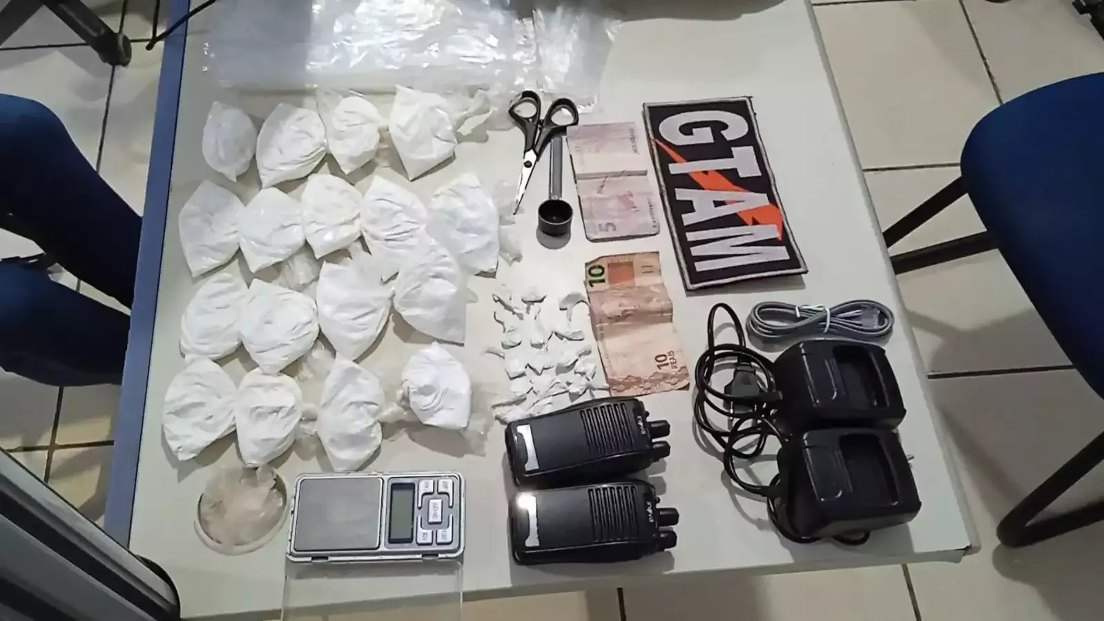 Em revista no terreno da casa foram encontradas várias porções de cocaína escondidas embaixo de pedras, e dentro do imóvel várias outros invólucros do mesmo entorpecente, totalizando 3,8kg da droga, além de balança de precisão e dois rádios HT desmontados.