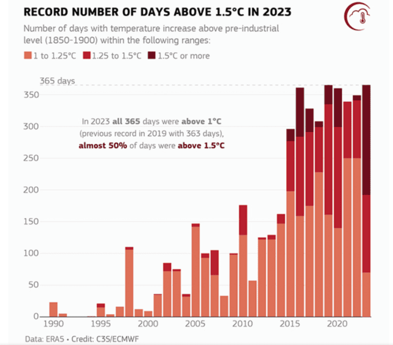 Além disso, em 2023 o mundo também passou, de maneira inédita, a marca preocupante dos 2°C no dia 18 de outubro. Como se isso já não fosse alarmante o suficiente, segundo vários cientistas, 2024 será ainda pior. A tendência é que esse ano a média de aquecimento anual deve passar de 1,5°C.