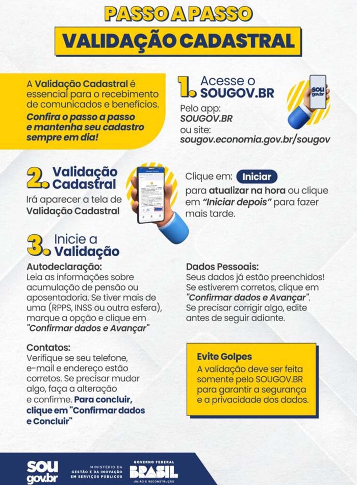 Porto Velho, RO - Servidores na ativa, aposentados e pensionistas devem obrigatoriamente realizar a Validação Cadastral, que neste ano, tem prazo até o dia 30 de abril, exclusivamente pela plataforma SOUGOV.BR, na internet ou pelo aplicativo.