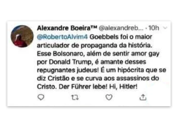 A Justiça avaliou que a mensagem dele sobre Bolsonaro e Trump evidencia as intenções não só de menosprezar os judeus, vítimas do Holocausto, mas também de exaltar o nazismo.