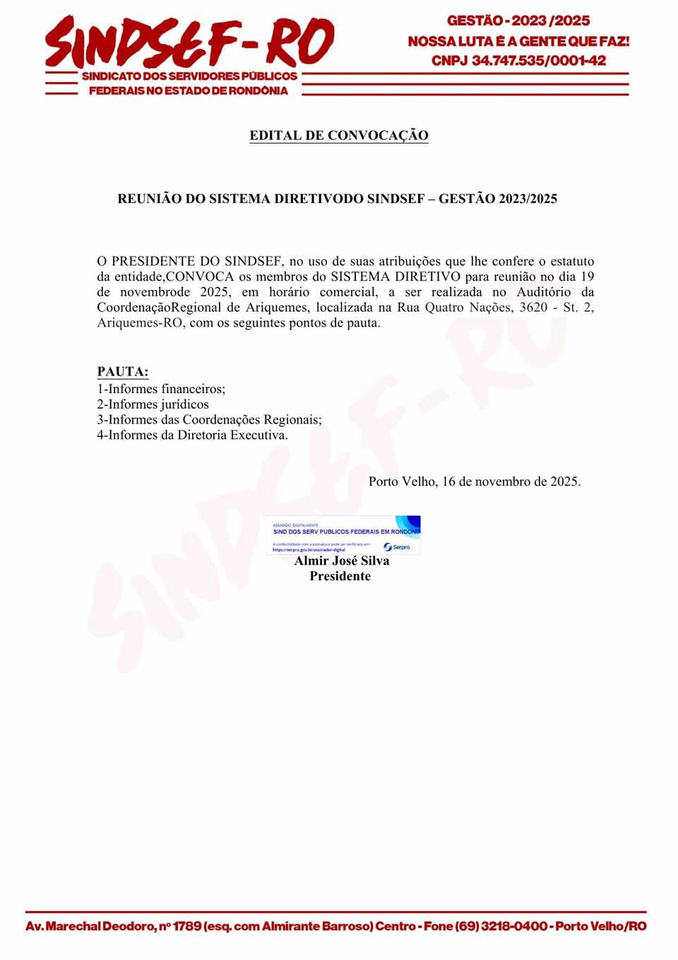 Porto Velho, RO - O presidente do Sindsef-ro, no uso de suas atribuições legais, que lho confere o estatuto da Entidade, convoca os membros do Sistema Diretivo, para reunião que ocorrerá no dia 19 de novembro, em horário comercial, a ser realizada no auditório na coordenação regional de Ariquemes: