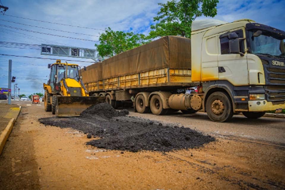 Na Avenida dos Imigrantes e no acesso ao residencial Orgulho do Madeira, equipes executam serviços de tapa-buracos.